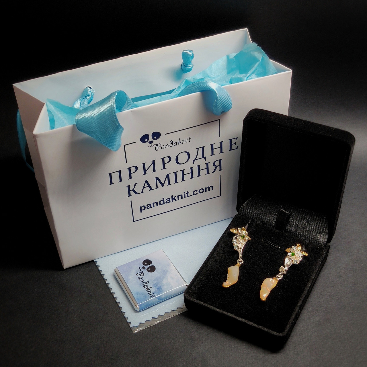 - Камені: природні - ефіопські опали, топази, хромдіопсиди
