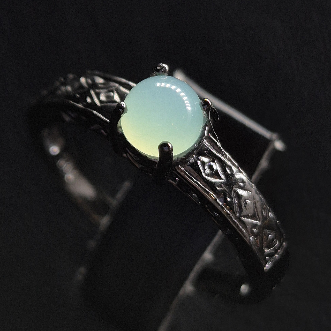 Срібна каблучка з натуральним хризопразом, візерунок у стилі вишиванки, з зеленим натуральним каменем. Розмір: 18