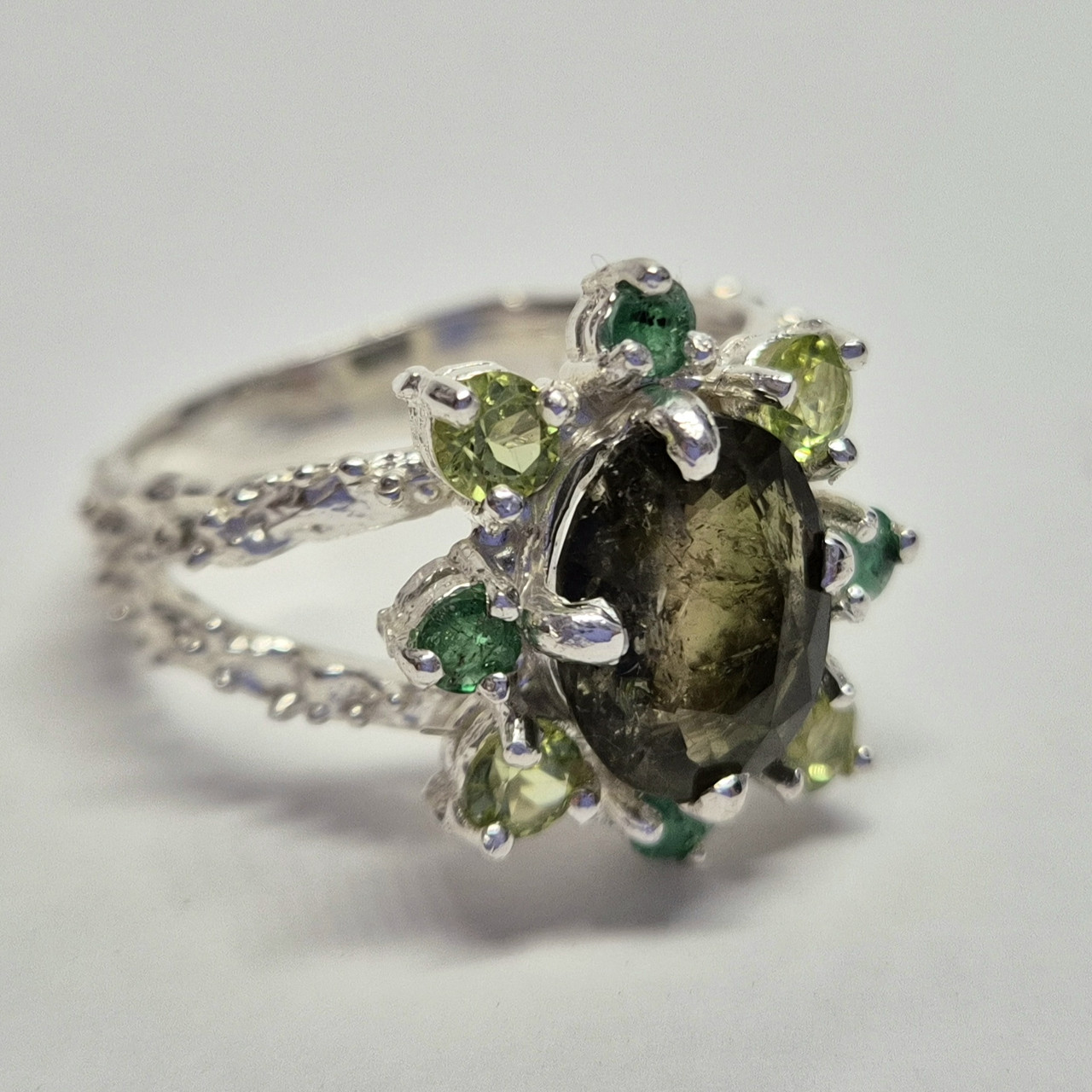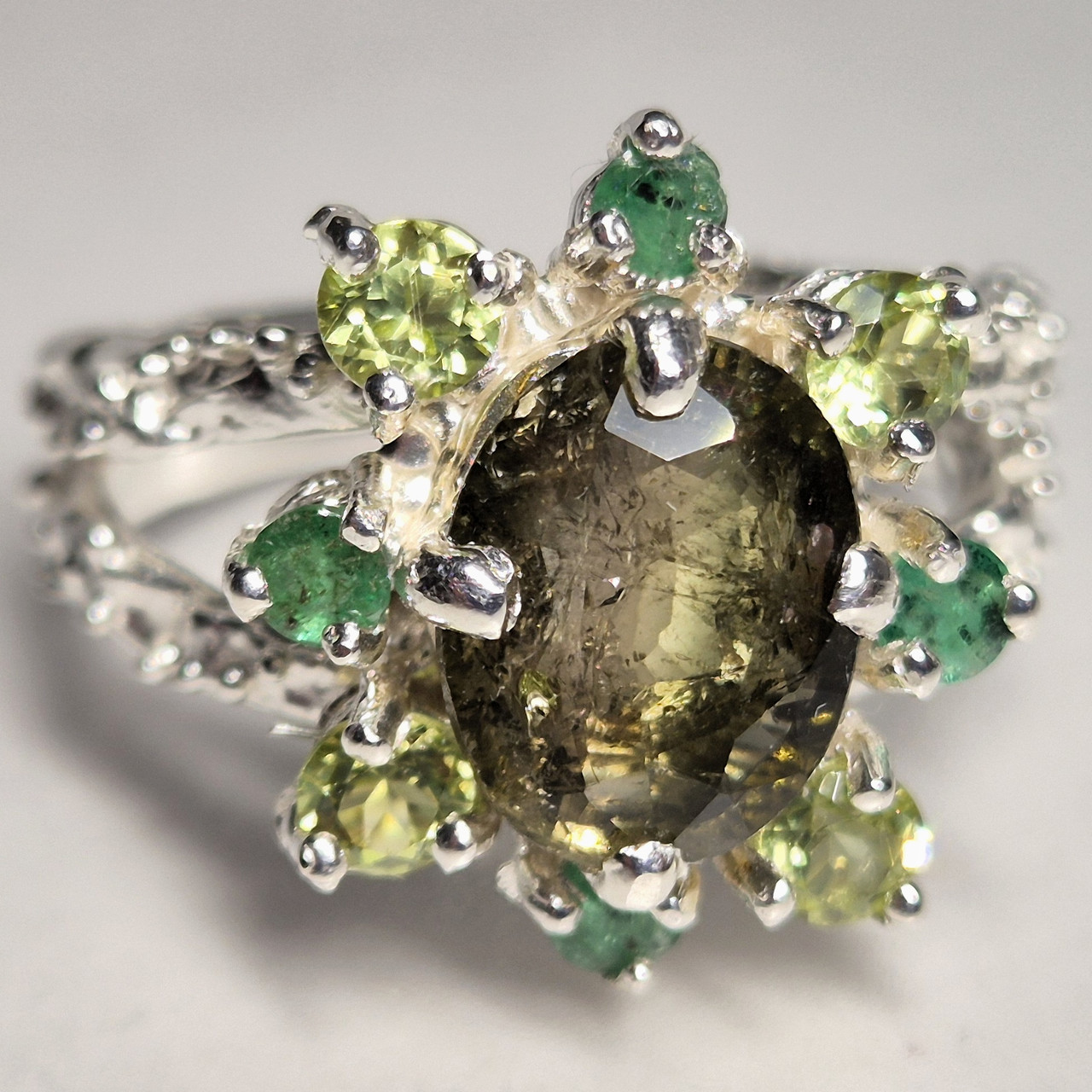 Каблучка срібна з природними турмаліном, смарагдами, хризолітами ручна робота майстрів Таїланду