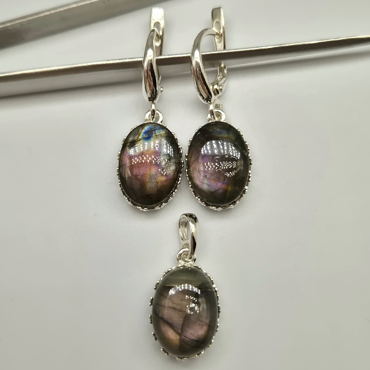 Комплект срібний з природним лабрадором в ажурній оправі: сережки та кулон з полупрозорим лабрадоритом овальної форми