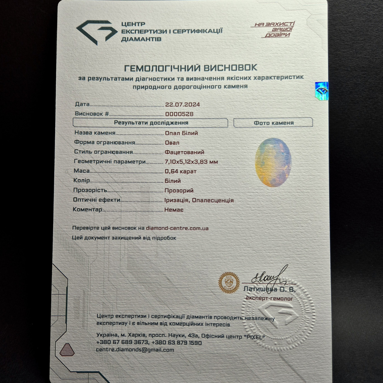 - Камені: природний опал з Ефіопії, — фото документу, що підтверджує природне походження каменю представлене в описі нижче (гемологічний сертифікат до кулона не додається, але за Вашим бажанням можемо доповнити таким документом саме Ваш кулон. Вартість послуги — від 1000 грн). Докладніше про гемологічну експертизу можна прочитати тут.
