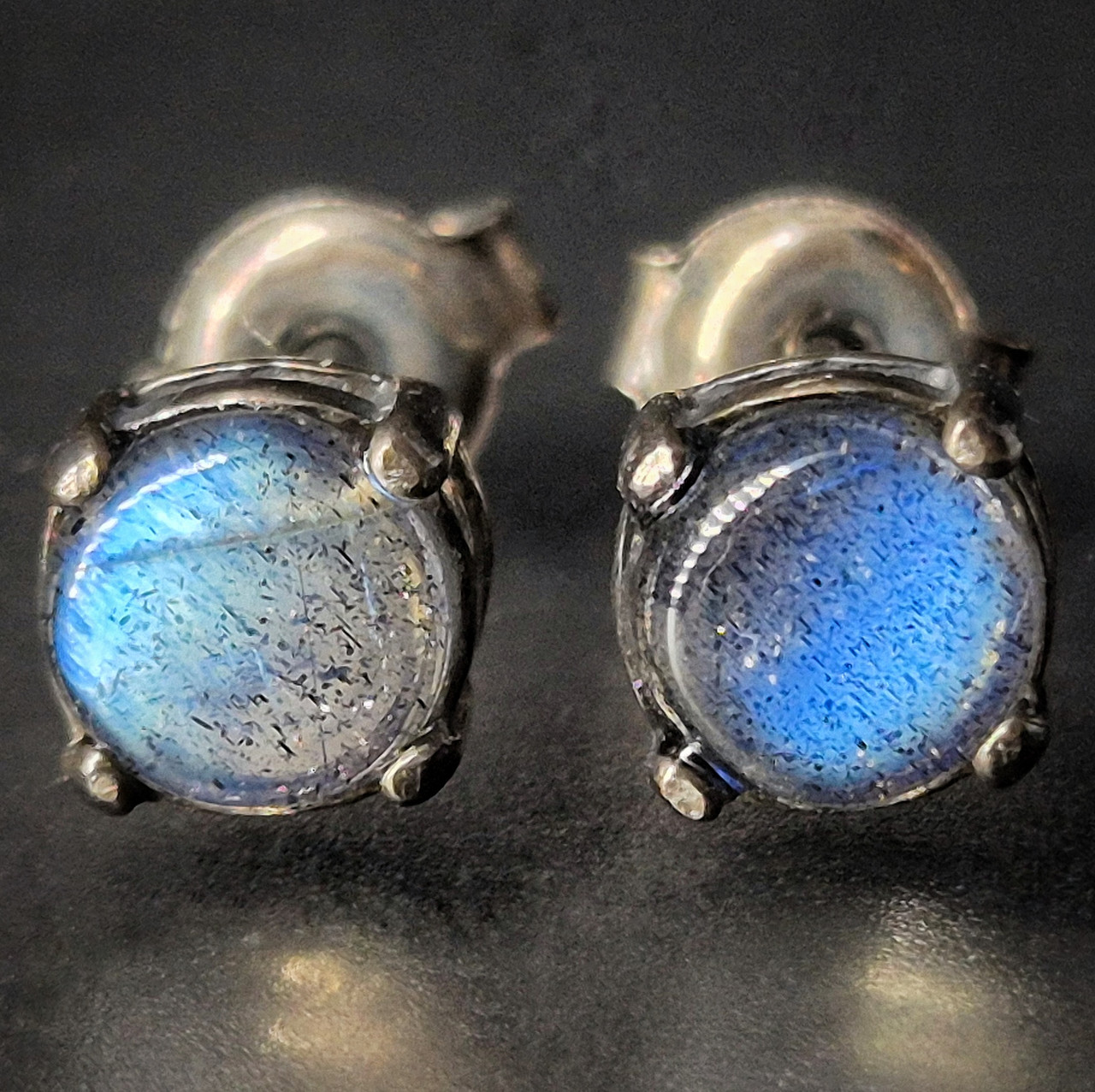Сережки-пусети з природним лабрадором чорного срібла, прозорий блакитний камінь мінімалістичні гвоздики